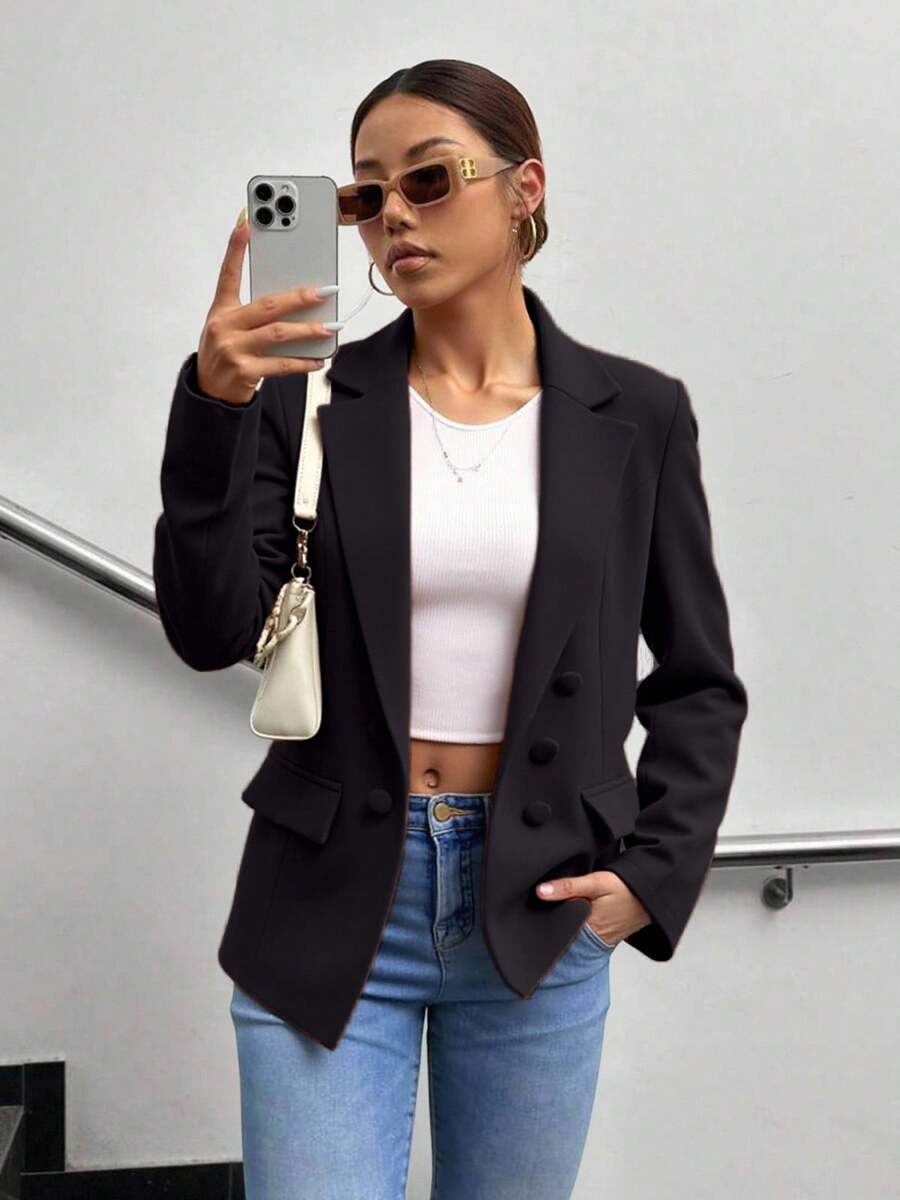 O blazer feminino de alfaiataria com 6 botões é a peça que transmite confiança, sofisticação e versatilidade em qualquer ocasião. Seu corte moderno com lapela clássica valoriza a silhueta de forma discreta, enquanto o design de botões duplos adiciona profundidade e personalidade ao look. Uma escolha ideal para quem deseja se sentir elegante e preparada em todas as situações, do escritório a encontros sociais.
