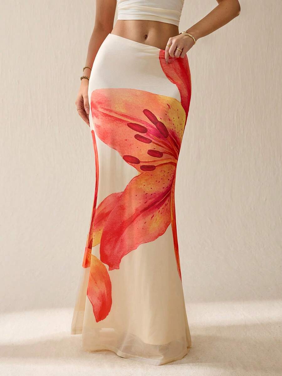 Saia Feminina Bege de Tule Longa com Estampa Floral Estilo Sereia